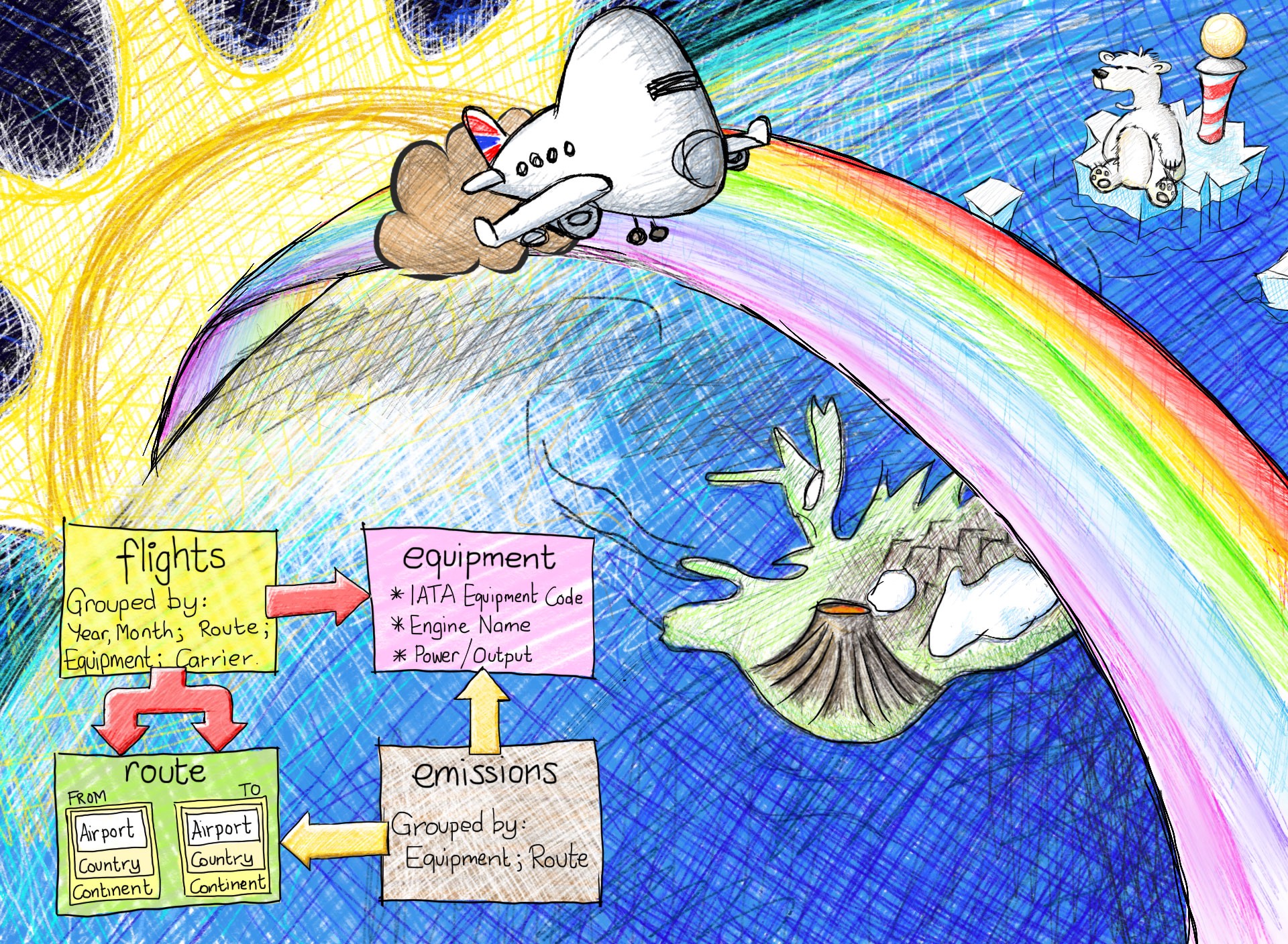Database entity-relationship diagrams can be dull, so I offered to improve a simple informal sketch for a friend doing a PhD thesis in aerospace emission analysis following the volcano eruption in Iceland — a volcano with an unpronounceable name I shunned in favour of “Magma Magmasson”. I don’t think she ended up using my version of the diagram. I’m not sure why.
