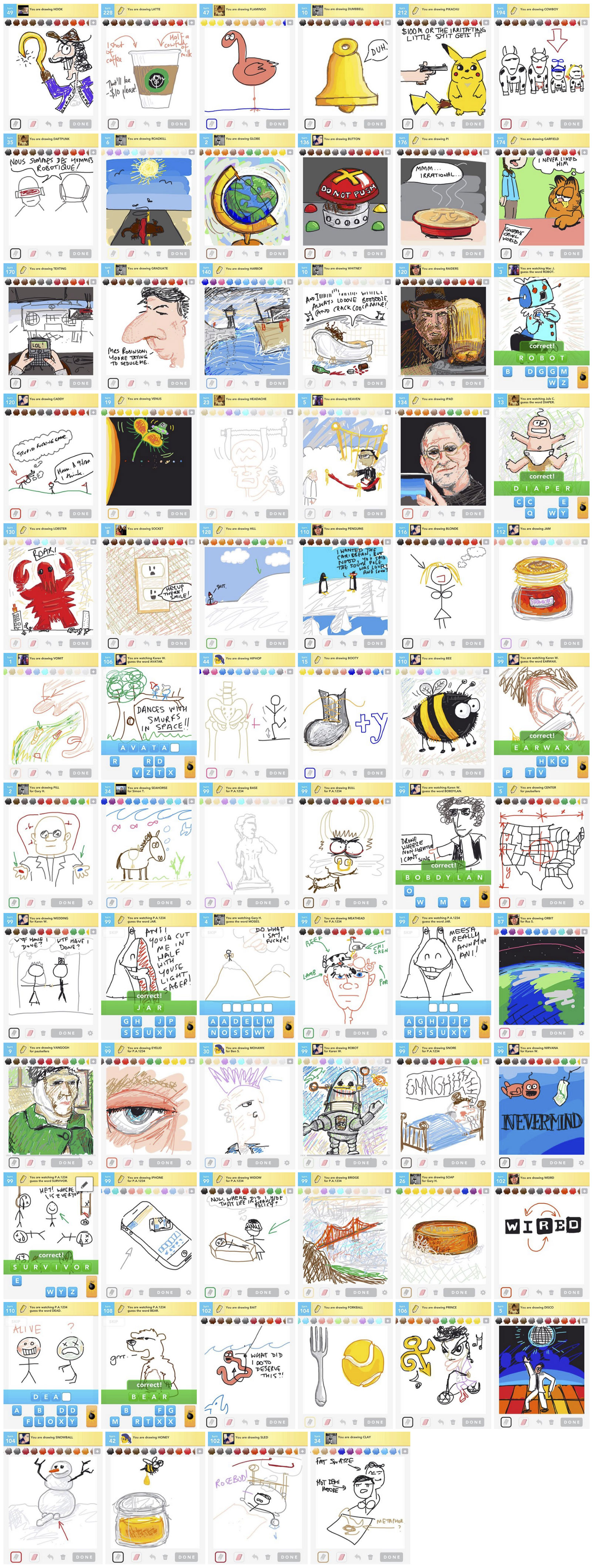 Anyway, Draw Something had the appeal of a limited palette, no tools to speak of, no editing, a limited number of brush strokes, and the patience of whoever I was sending to. Not only that, I was using just my finger and an iPhone 4 and/or the equally-underpowered iPad 1. These limitations made the fast sketch creativity fun. I’m glad I took some screenshots along the way.