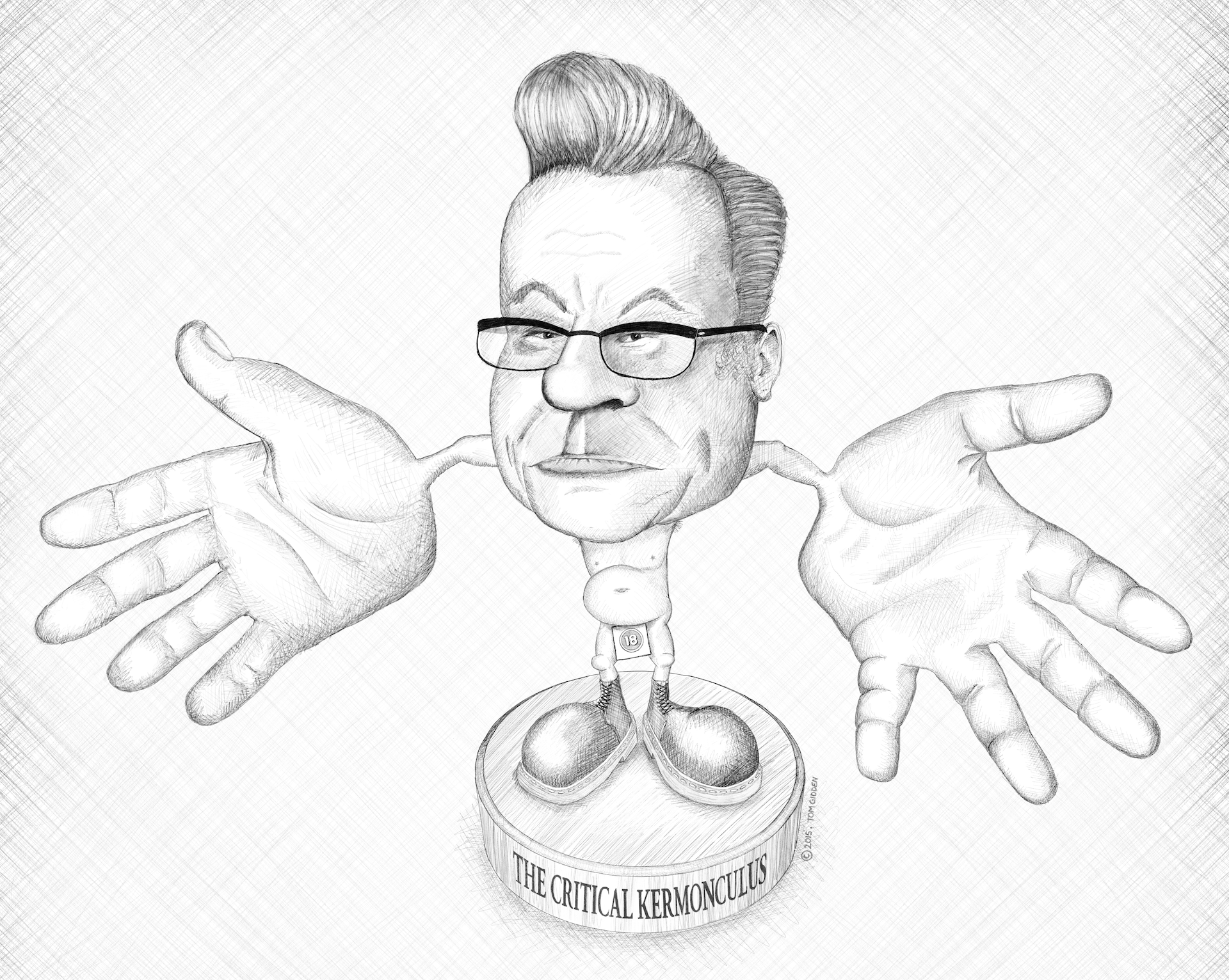 A caricature of Dr. Mark Kermode, Cinema Critic and Broadcaster, co-host (well, “contributor”) to the film review show on BBC Radio 5 Live. He has gigantic flappy hands.