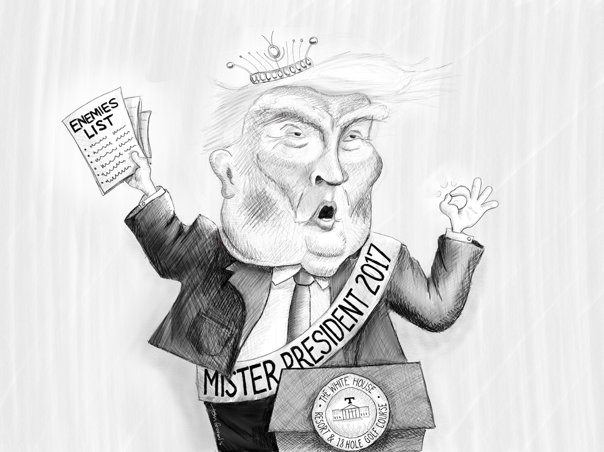 A week after Trump’s win, it sunk in. There’s nothing nice I can say about that “man”. I couldn’t capture his fat smug petulant visage, but I had a go. While it’s not my best work, I did manage to cram a look of vinegary hate into it. I knew he’d start acting like he’s king (hence the crown), and he’d never get sick of that obnoxious thing he does with his hand. Clearly I was mistaken about him turning the White House into a golf course; instead, he’d just turn his golf course into the White House.